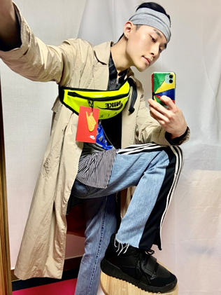 트렌치코트와 스포티함이 가득한 힙색, 팬츠를 같이 매치했습니다.