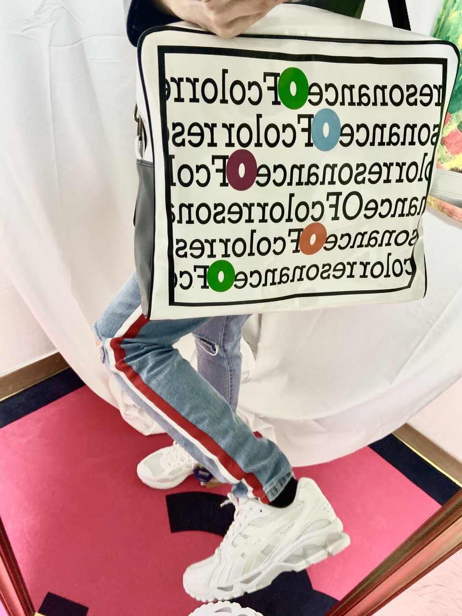 먼저 레트로한 빅 크로스백과 사이드라인 팬츠를 매치해봤어요!